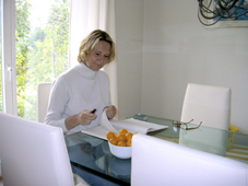 Früher, als ich noch kein Arbeitszimmer hatte, habe ich meine Bücher nämlich alle mit der Hand am Küchentisch geschrieben, und darum fällt mir an einem Tisch, der eigentlich zum Essen da ist, einfach immer noch am meisten ein.